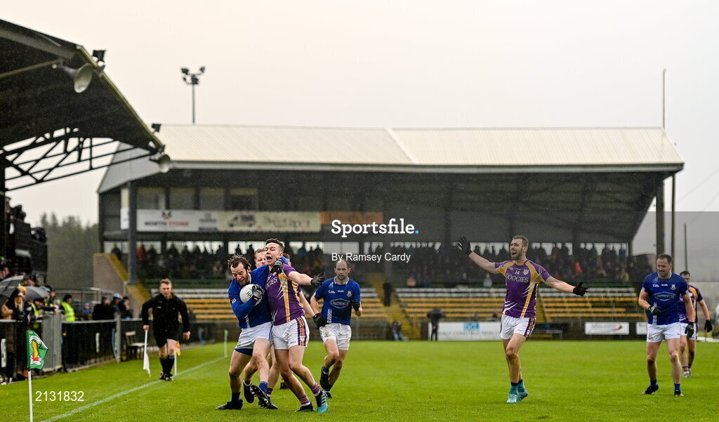 4 December 2021; Paul McHugh of Dromore and Shane McGullion of Derrygonnelly Harps, in front of The Nally Stand, during the AIB Ulster GAA Football Senior Club Championship Quarter-Final match between Dromore and Derrygonnelly Harps at Páirc Colmcille in Carrickmore, Tyrone. Photo by Ramsey Cardy/Sportsfile