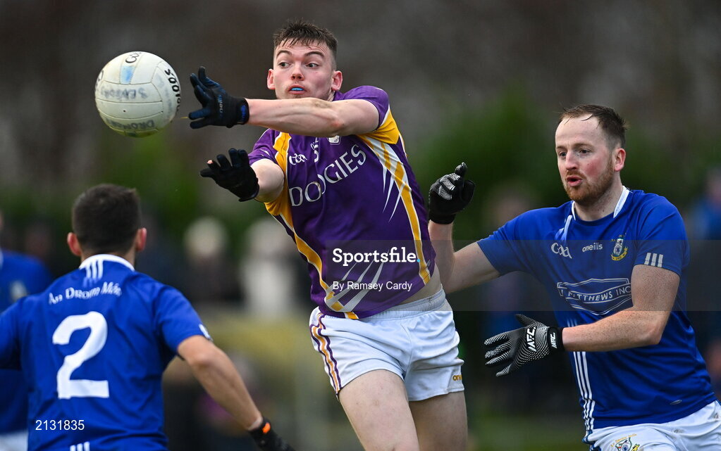 4 December 2021; Oisin Smyth of Derrygonnelly Harps in action against Sean McNabb of Dromore during the AIB Ulster GAA Football Senior Club Championship Quarter-Final match between Dromore and Derrygonnelly Harps at Páirc Colmcille in Carrickmore, Tyrone. Photo by Ramsey Cardy/Sportsfile