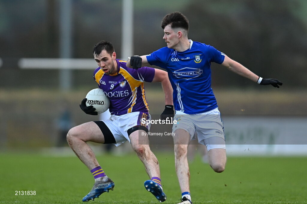 4 December 2021; Ryan Jones of Derrygonnelly Harps in action against Nathan McCarron of Dromore during the AIB Ulster GAA Football Senior Club Championship Quarter-Final match between Dromore and Derrygonnelly Harps at Páirc Colmcille in Carrickmore, Tyrone. Photo by Ramsey Cardy/Sportsfile