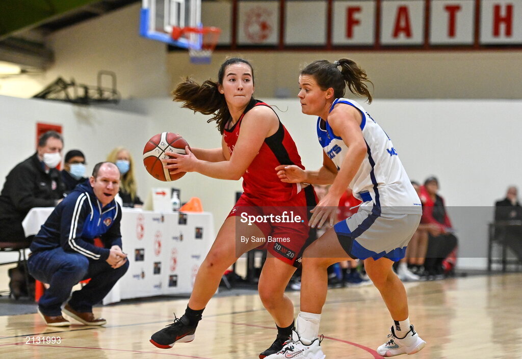 4 December 2021; Amy Corkery of Fr Mathews in action against Sinead Deegan of WIT Waterford Wildcats during the InsureMyHouse.ie Paudie O’Connor Cup Quarter-Final match between Fr. Mathews and WIT Waterford Wildcats at Fr. Mathews Arena in Cork. Photo by Sam Barnes/Sportsfile