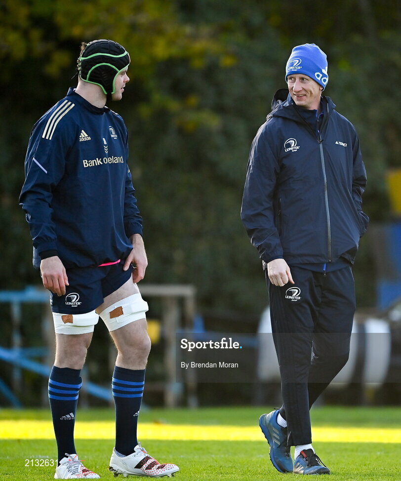 6 December 2021; James Ryan, left, and head coach Leo Cullen during Leinster Rugby squad training at UCD in Dublin. Photo by Brendan Moran/Sportsfile