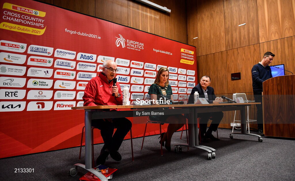 11 December 2021; Liam Hennessy, Local Organising Committee Chairperson, left, speaking during a press conference ahead of the SPAR European Cross Country Championships Fingal-Dublin 2021 at the Sport Ireland Campus in Dublin. Photo by Sam Barnes/Sportsfile