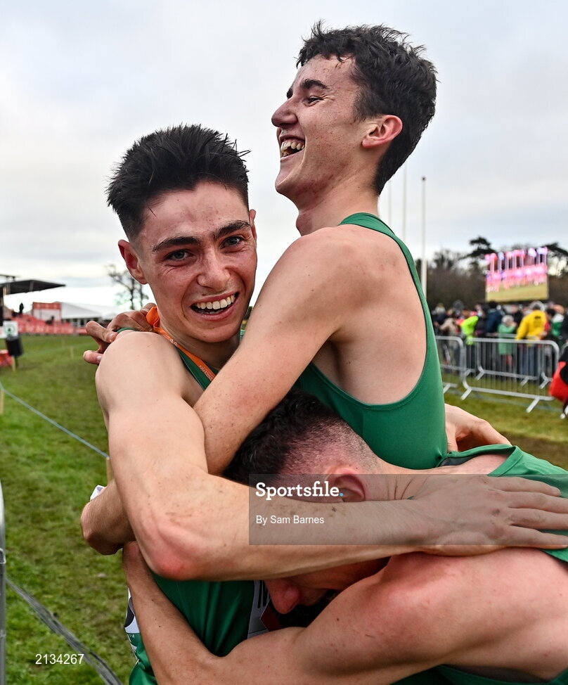12 December 2021; Darragh McElhinney of Ireland celebrates with Keelan Kilrehill, bottom, and Michael Power after competing in the U23 Men's 8000m during the SPAR European Cross Country Championships Fingal-Dublin 2021 at the Sport Ireland Campus in Dublin. Photo by Sam Barnes/Sportsfile