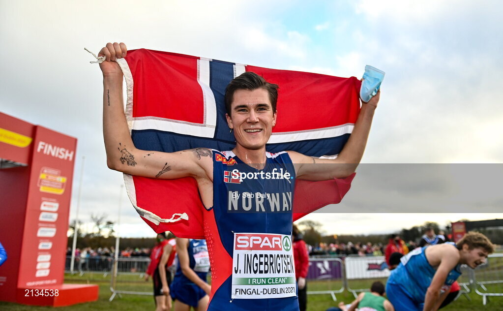 12 December 2021; Jakob Ingebrigtsen of Norway celebrates after winning the Senior Men's 10000m final during the SPAR European Cross Country Championships Fingal-Dublin 2021 at the Sport Ireland Campus in Dublin. Photo by Seb Daly/Sportsfile