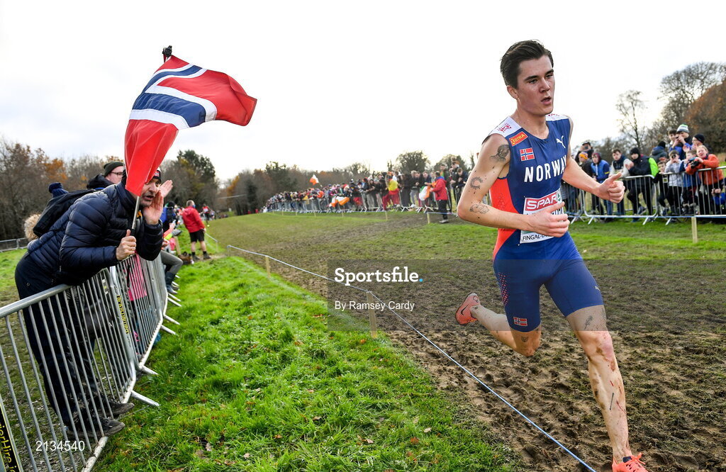 12 December 2021; Jakob Ingebrigtsen of Norway on his way to winning the Senior Men's 10000m final during the SPAR European Cross Country Championships Fingal-Dublin 2021 at the Sport Ireland Campus in Dublin. Photo by Ramsey Cardy/Sportsfile