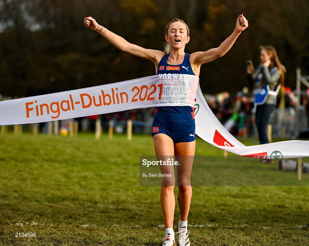 12 December 2021; Karoline Bjerkeli Grøvdal of Norway celebrates as she crosses the finish line to win the Senior Women's 8000m final during the SPAR European Cross Country Championships Fingal-Dublin 2021 at the Sport Ireland Campus in Dublin. Photo by Sam Barnes/Sportsfile