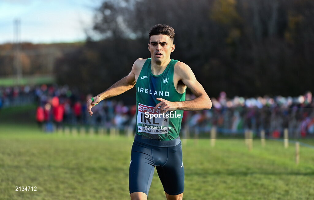 12 December 2021; Andrew Coscoran of Ireland crosses the line in fourth place in the Mixed Relay final during the SPAR European Cross Country Championships Fingal-Dublin 2021 at the Sport Ireland Campus in Dublin. Photo by Sam Barnes/Sportsfile