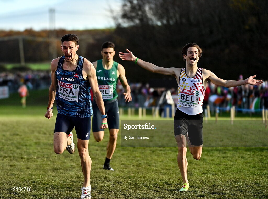 12 December 2021; Alexis Miellet of France, left, celebrates as he crosses the line in second place ahead of Stijn Baeten of Belgium in the Mixed Relay final during the SPAR European Cross Country Championships Fingal-Dublin 2021 at the Sport Ireland Campus in Dublin. Photo by Sam Barnes/Sportsfile