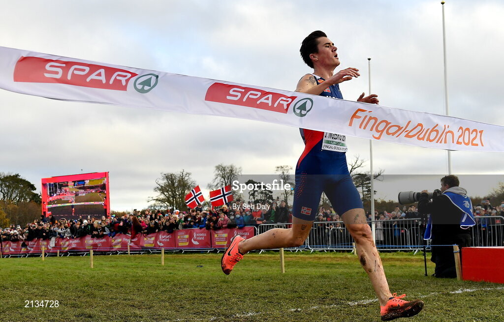 12 December 2021; Jakob Ingebrigtsen of Norway crosses the finish line to win the Senior Men's 10,000m during the SPAR European Cross Country Championships Fingal-Dublin 2021 at the Sport Ireland Campus in Dublin. Photo by Seb Daly/Sportsfile