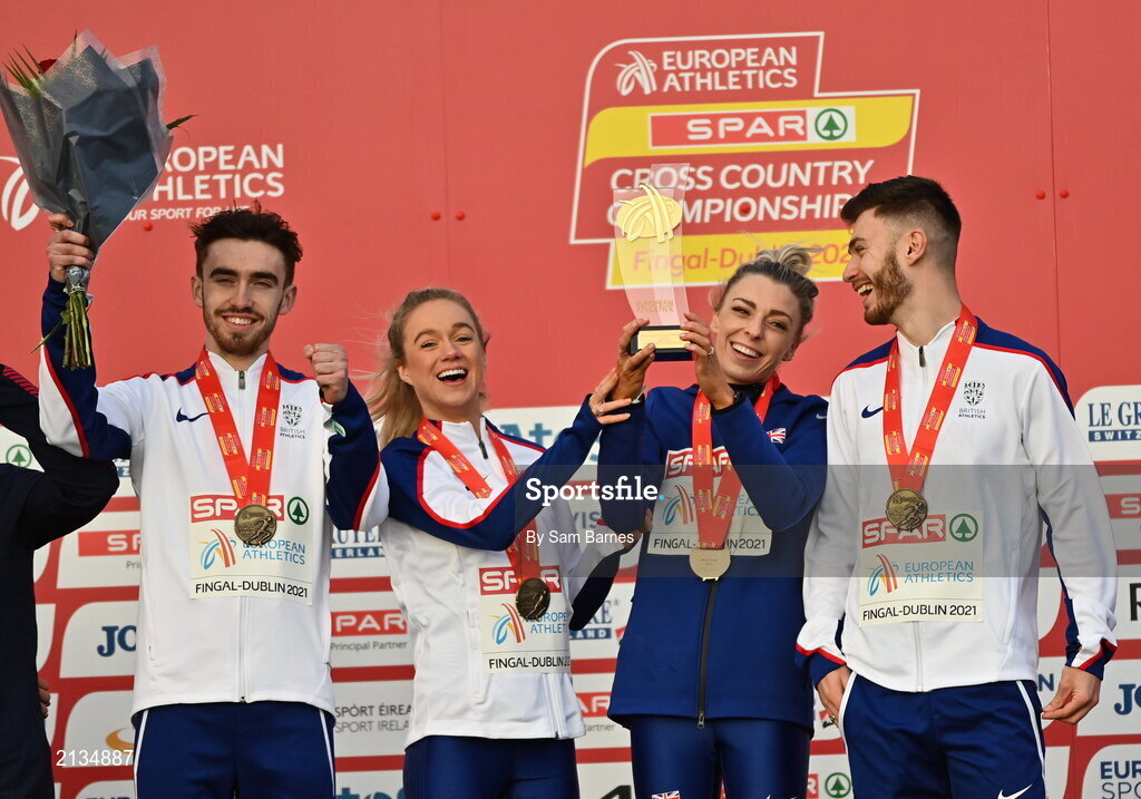 12 December 2021; Gold medalists, Team GB celebrate with their medals and trophy during the medal ceremony for the Mixed Relay final at the SPAR European Cross Country Championships Fingal-Dublin 2021 at the Sport Ireland Campus in Dublin. Photo by Sam Barnes/Sportsfile
