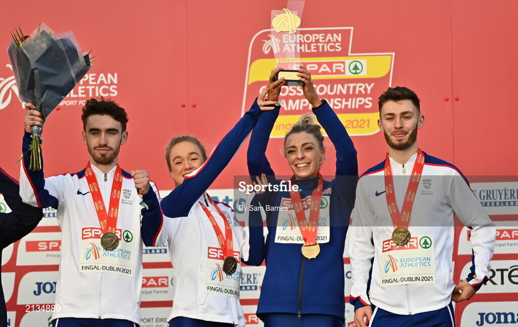 12 December 2021; Gold medalists, Team GB celebrate with their medals and trophy during the medal ceremony for the Mixed Relay final at the SPAR European Cross Country Championships Fingal-Dublin 2021 at the Sport Ireland Campus in Dublin. Photo by Sam Barnes/Sportsfile