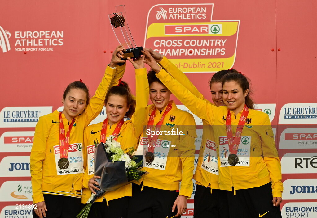 12 December 2021; U20 Women's 4000m team gold medalists, Team Germany celebrate with their medals and trophy during the medal ceremony at the SPAR European Cross Country Championships Fingal-Dublin 2021 at the Sport Ireland Campus in Dublin. Photo by Sam Barnes/Sportsfile