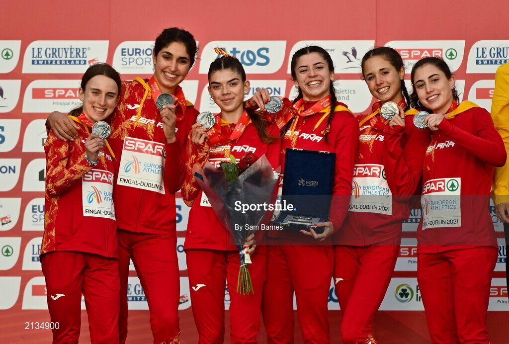 12 December 2021; U20 Women's 4000m team silver medalists, Team Spain celebrate with their medals during the medal ceremony at the SPAR European Cross Country Championships Fingal-Dublin 2021 at the Sport Ireland Campus in Dublin. Photo by Sam Barnes/Sportsfile