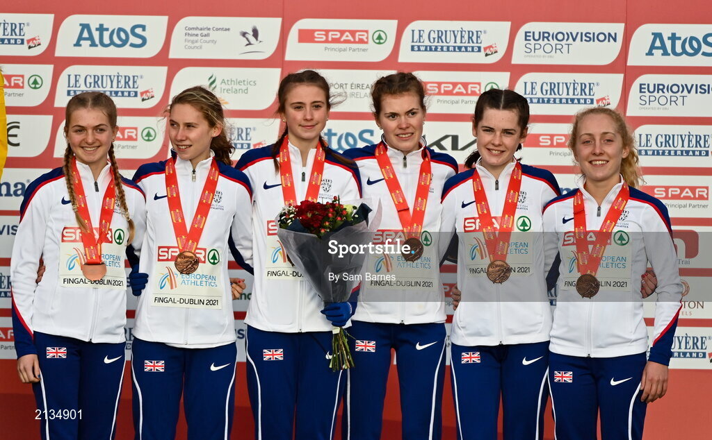 12 December 2021; U20 Women's 4000m team bronze medalists, Team GB celebrate with their medals during the medal ceremony at the SPAR European Cross Country Championships Fingal-Dublin 2021 at the Sport Ireland Campus in Dublin. Photo by Sam Barnes/Sportsfile