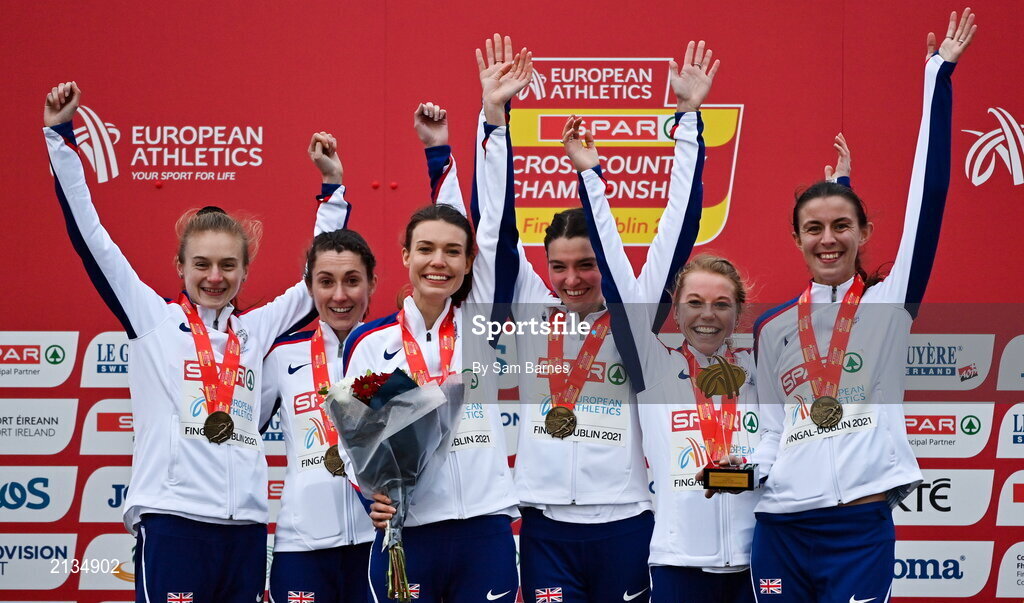 12 December 2021; Senior Women's 8000m team gold medalists, Team GB celebrate with their medals and trophy during the medal ceremony at the SPAR European Cross Country Championships Fingal-Dublin 2021 at the Sport Ireland Campus in Dublin. Photo by Sam Barnes/Sportsfile