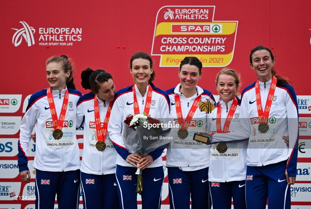 12 December 2021; Senior Women's 8000m team gold medalists, Team GB celebrate with their medals and trophy during the medal ceremony at the SPAR European Cross Country Championships Fingal-Dublin 2021 at the Sport Ireland Campus in Dublin. Photo by Sam Barnes/Sportsfile