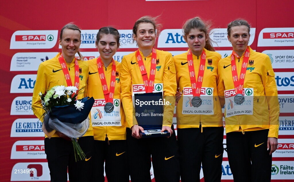 12 December 2021; Senior Women's 8000m team silver medalists, Team Germany celebrate with their medals during the medal ceremony at the SPAR European Cross Country Championships Fingal-Dublin 2021 at the Sport Ireland Campus in Dublin. Photo by Sam Barnes/Sportsfile