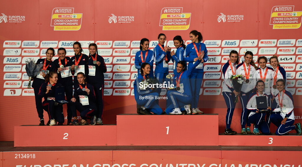 12 December 2021; U23 Women's 6000m team medalists, from left, Team France, silver, Team Italy, gold, and Team GB, bronze, celebrate with their medals during the medal ceremony at the SPAR European Cross Country Championships Fingal-Dublin 2021 at the Sport Ireland Campus in Dublin. Photo by Sam Barnes/Sportsfile