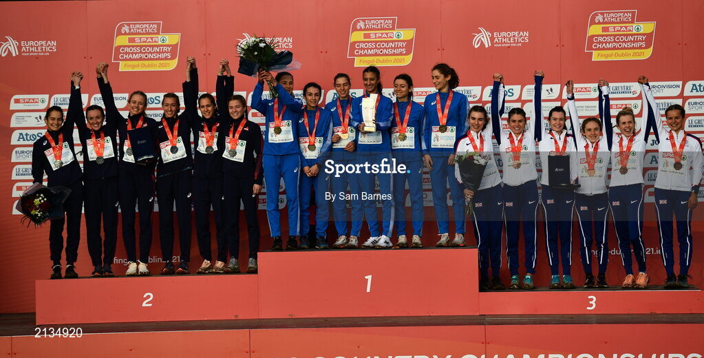 12 December 2021; U23 Women's 6000m team medalists, from left, Team France, silver, Team Italy, gold, and Team GB, bronze, celebrate with their medals during the medal ceremony at the SPAR European Cross Country Championships Fingal-Dublin 2021 at the Sport Ireland Campus in Dublin. Photo by Sam Barnes/Sportsfile
