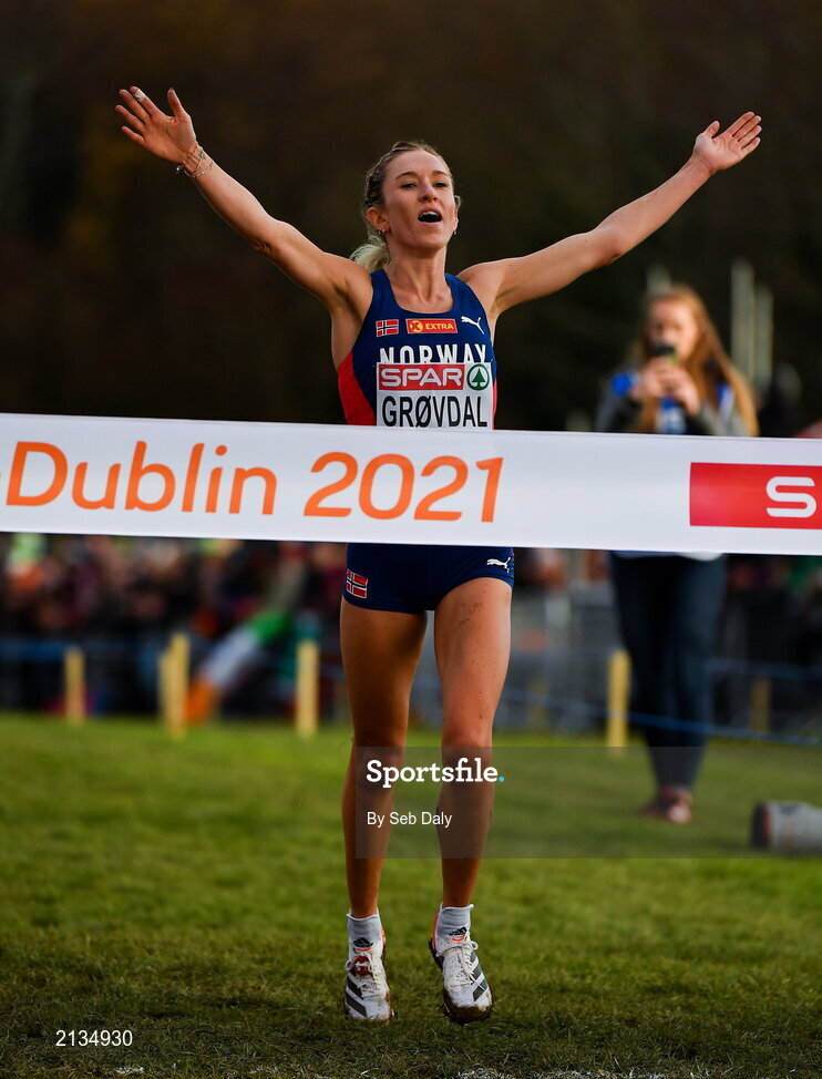 12 December 2021; Karoline Bjerkeli Grøvdal of Norway celebrates as she crosses the line to win the Senior Women's 8000m final at the SPAR European Cross Country Championships Fingal-Dublin 2021 at the Sport Ireland Campus in Dublin. Photo by Seb Daly/Sportsfile