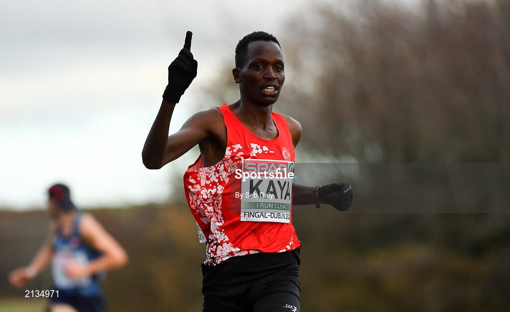 12 December 2021; Aras Kaya of Turkey celebrates as he crosses the line to finish second in the Senior Men's 10,000m final during the SPAR European Cross Country Championships Fingal-Dublin 2021 at the Sport Ireland Campus in Dublin. Photo by Seb Daly/Sportsfile