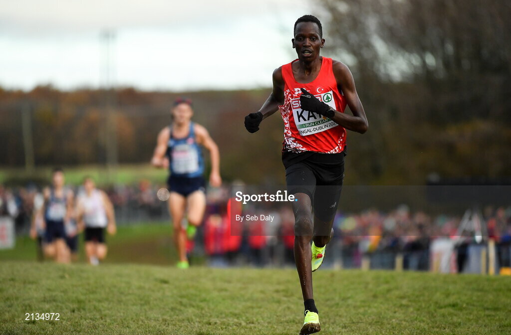 12 December 2021; Aras Kaya of Turkey crosses the line to finish second in the Senior Men's 10,000m final during the SPAR European Cross Country Championships Fingal-Dublin 2021 at the Sport Ireland Campus in Dublin. Photo by Seb Daly/Sportsfile