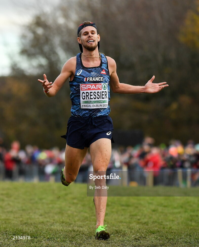 12 December 2021; Jimmy Gressier of France crosses the line to finish third in the Senior Men's 10,000m final during the SPAR European Cross Country Championships Fingal-Dublin 2021 at the Sport Ireland Campus in Dublin. Photo by Seb Daly/Sportsfile