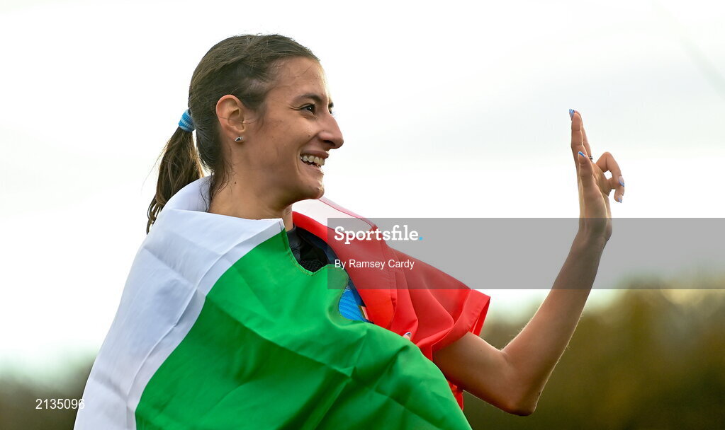 12 December 2021; Nadia Battocletti of Italy celebrates after winning the U23 Women's 6000m during the SPAR European Cross Country Championships Fingal-Dublin 2021 at the Sport Ireland Campus in Dublin. Photo by Ramsey Cardy/Sportsfile