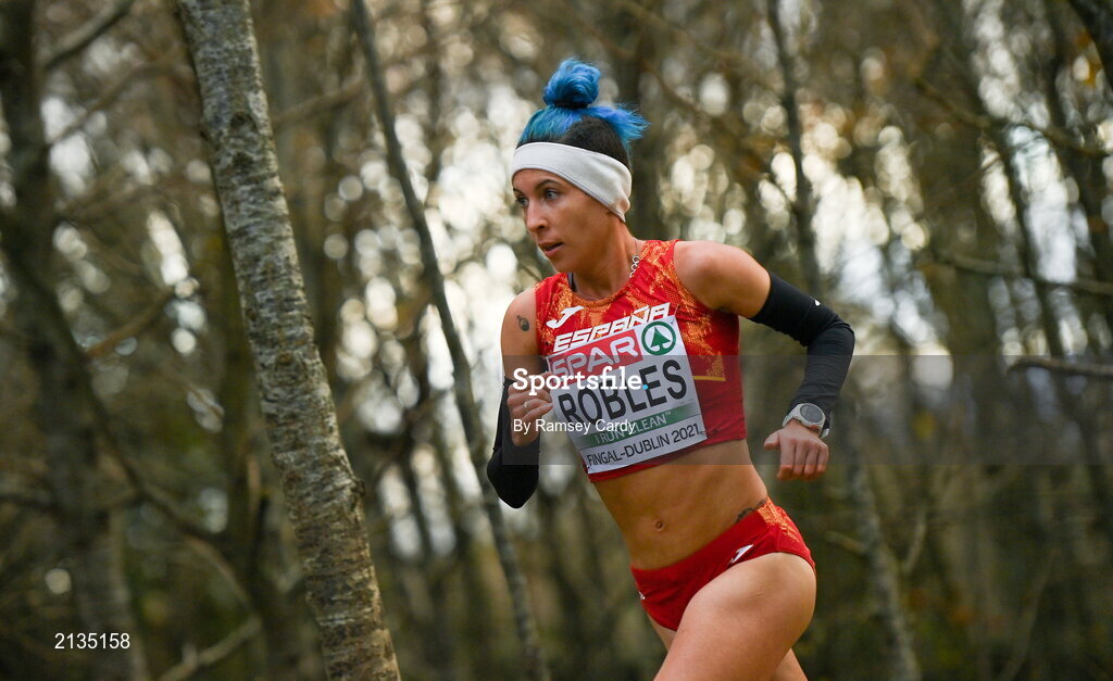 12 December 2021; Carolina Robles of Spain competes in the Senior Women's race during the SPAR European Cross Country Championships Fingal-Dublin 2021 at the Sport Ireland Campus in Dublin. Photo by Ramsey Cardy/Sportsfile