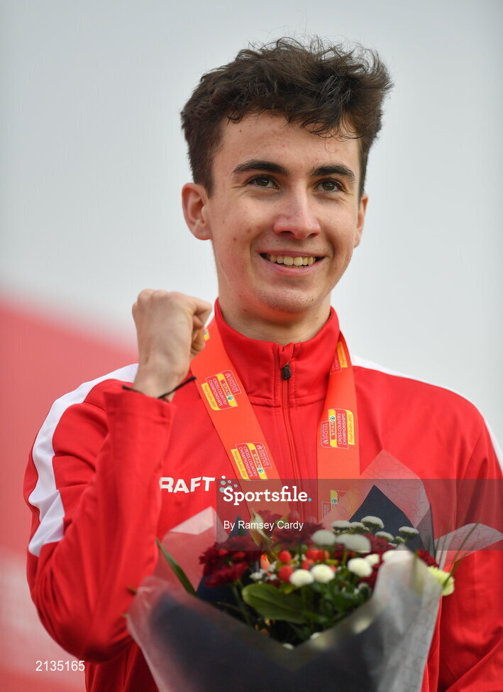 12 December 2021; Axel Vang Christensen of Denmark on the podium after the Under 20 Men's race during the SPAR European Cross Country Championships Fingal-Dublin 2021 at the Sport Ireland Campus in Dublin. Photo by Ramsey Cardy/Sportsfile