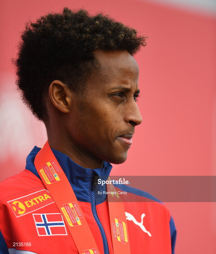 12 December 2021; Joel Ibler Lillesø of Denmark on the podium after the Under 20 Men's race during the SPAR European Cross Country Championships Fingal-Dublin 2021 at the Sport Ireland Campus in Dublin. Photo by Ramsey Cardy/Sportsfile