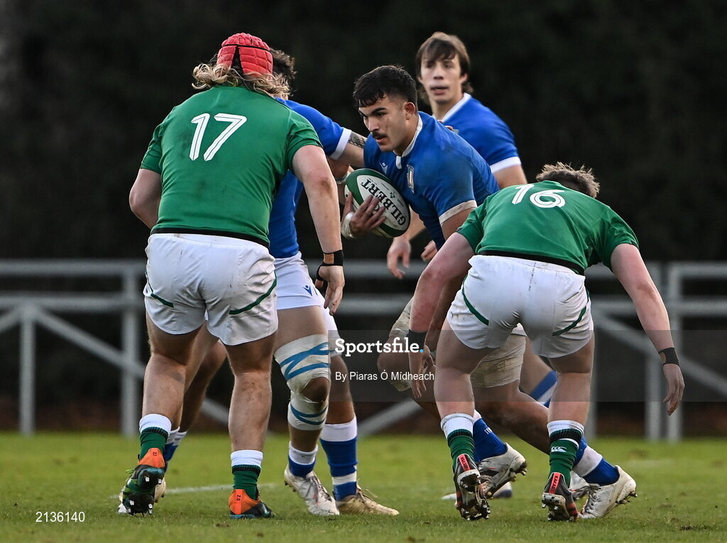 18 December 2021; Giacomo Ferrari of Italy in action against Kieran Ryan, 17, and Scott Wilson of Ireland during the U20's International match between Ireland and Italy at UCD Bowl in Dublin. Photo by Piaras Ó Mídheach/Sportsfile