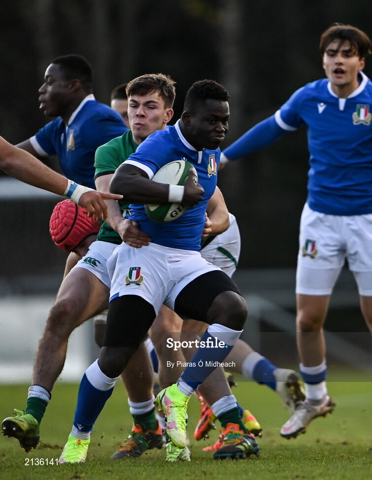 18 December 2021; David Odiase of Italy is tackled by Matthew Devine of Ireland during the U20's International match between Ireland and Italy at UCD Bowl in Dublin. Photo by Piaras Ó Mídheach/Sportsfile