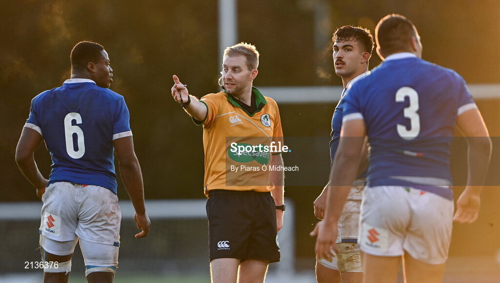 18 December 2021; Referee Dan Carson during the U20's International match between Ireland and Italy at UCD Bowl in Dublin. Photo by Piaras Ó Mídheach/Sportsfile