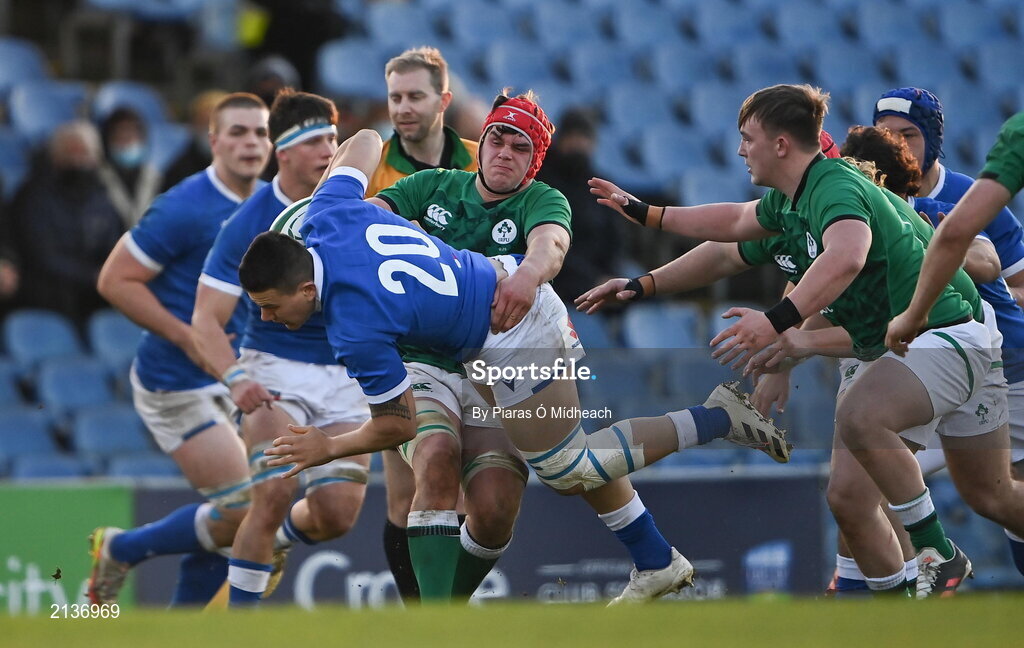 18 December 2021; Tommaso Scramoncin of Italy is tackled by James McNabney of Ireland during the U20's International match between Ireland and Italy at UCD Bowl in Dublin. Photo by Piaras Ó Mídheach/Sportsfile