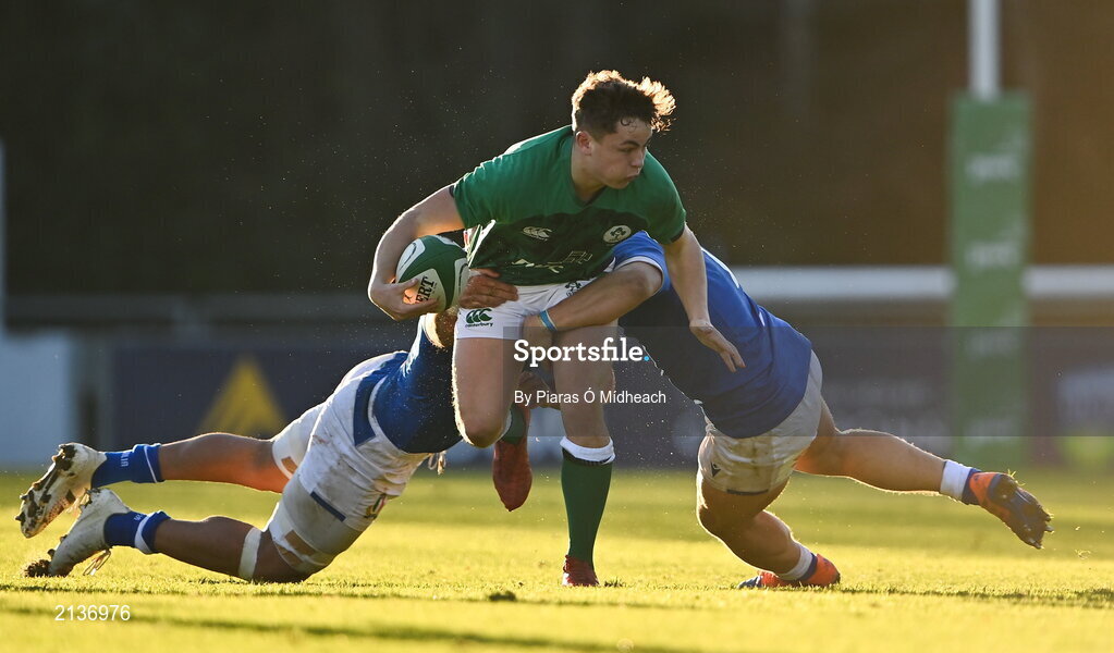 18 December 2021; Tony Butler of Ireland in action against Giacomo Ferrari, left, and Luca Rizzoli of Italy during the U20's International match between Ireland and Italy at UCD Bowl in Dublin. Photo by Piaras Ó Mídheach/Sportsfile