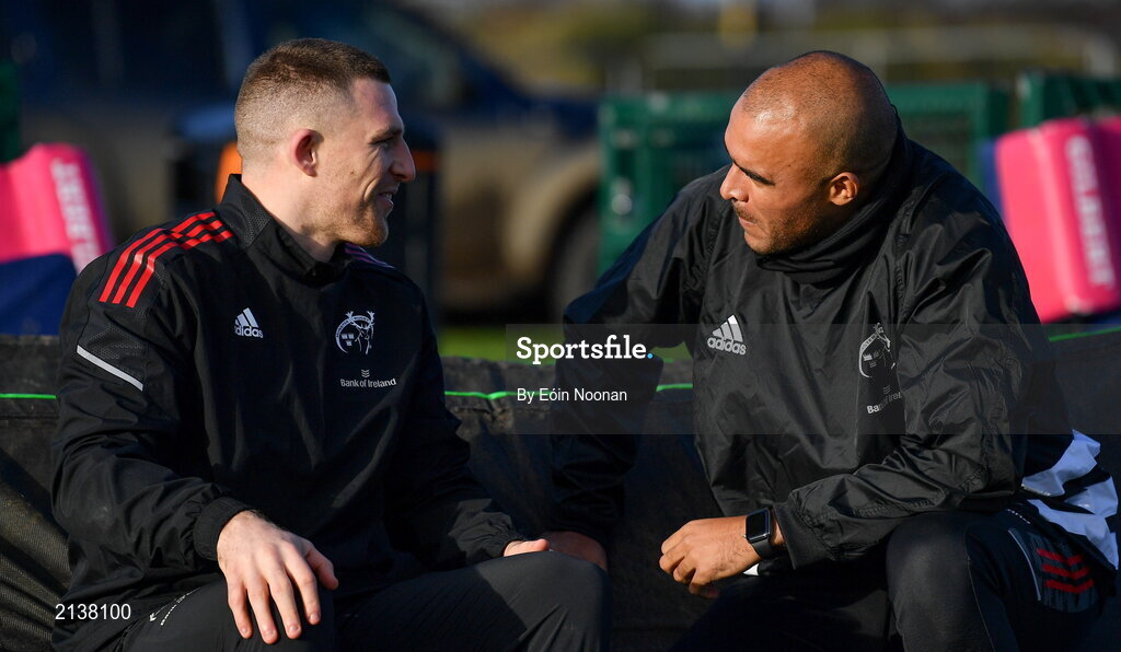 4 January 2022; Andrew Conway, left, and Simon Zebo during Munster rugby squad training at University of Limerick in Limerick. Photo by Eóin Noonan/Sportsfile