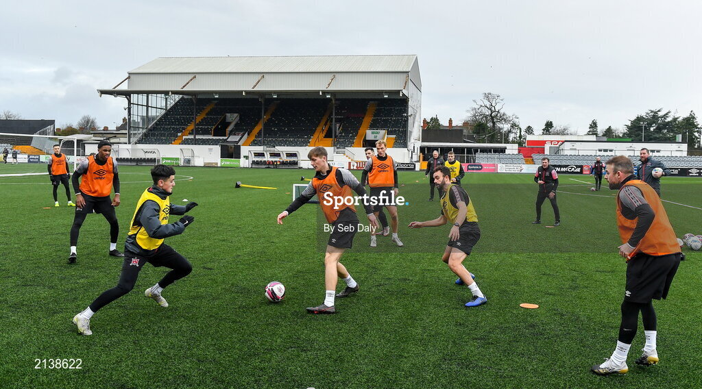 6 January 2022; Dundalk players Mark Hanratty, centre, with Ryan O'Kane, left, and Robbie Benson, right, during a Dundalk pre-season training session at Oriel Park in Dundalk, Louth. Photo by Seb Daly/Sportsfile