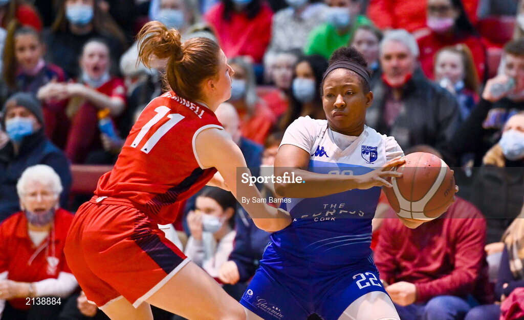 7 January 2022; Carrie Shepard of The Address UCC Glanmire in action against Edel Thornton of Singleton Supervalu Brunell during the InsureMyHouse.ie Paudie O’Connor Cup semi-final match between The Address UCC Glanmire and Singleton's SuperValu Brunell at Neptune Stadium in Cork. Photo by Sam Barnes/Sportsfile