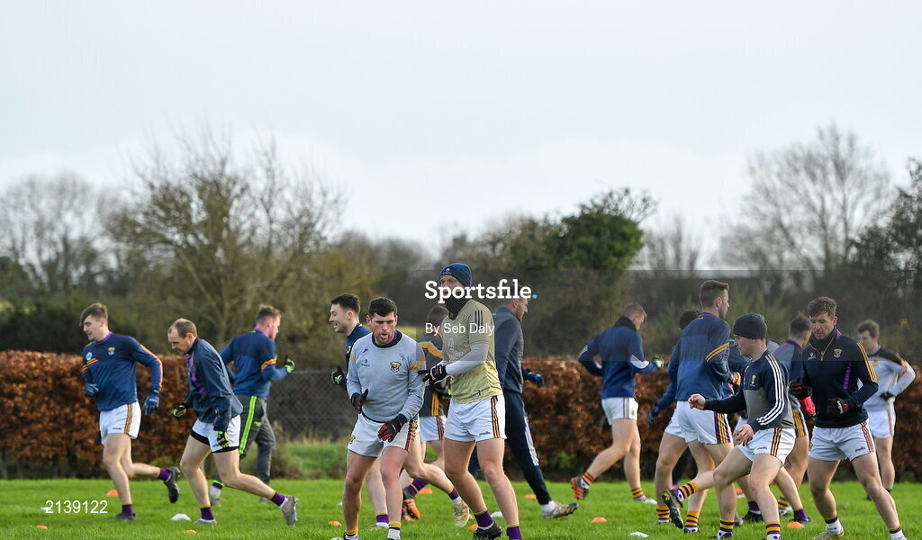 8 January 2022; Wexford players warm-up before their O'Byrne Cup group B match against Laois at Hollymount in Galbally, Wexford. Photo by Seb Daly/Sportsfile