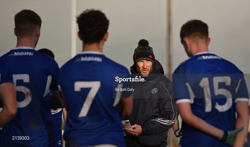 8 January 2022; Laois manager Billy Sheehan talks to his players at half-time during the O'Byrne Cup group B match between Wexford and Laois at Hollymount in Galbally, Wexford. Photo by Seb Daly/Sportsfile