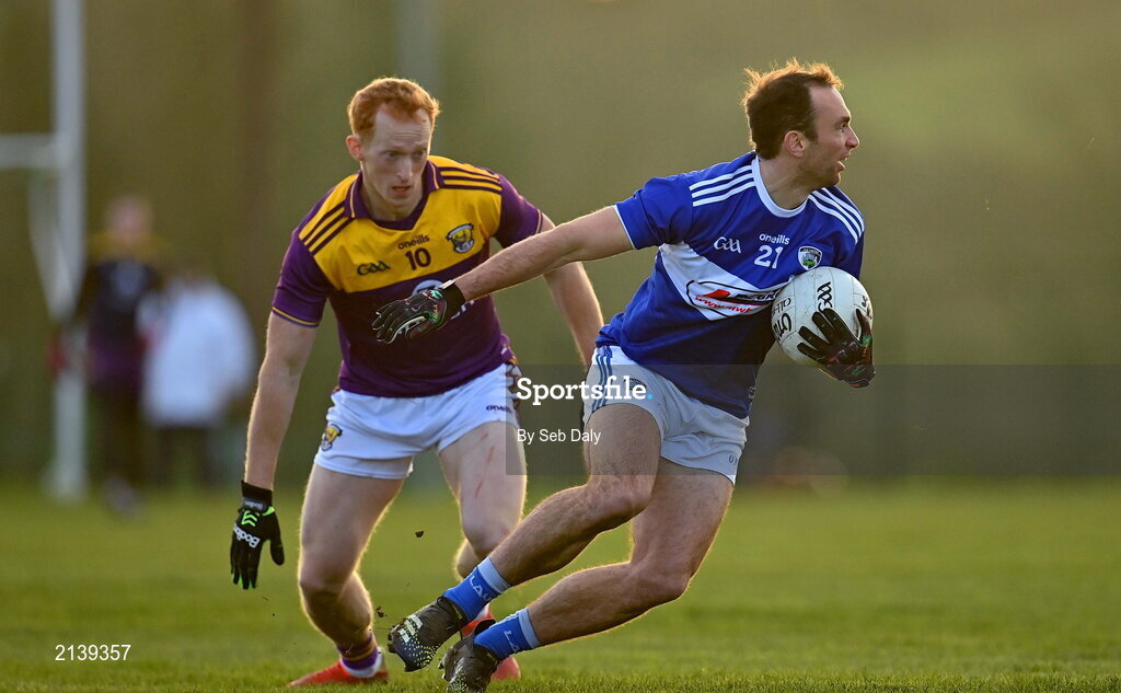 8 January 2022; Gareth Dillon of Laois in action against Alan Tobin of Wexford during the O'Byrne Cup group B match between Wexford and Laois at Hollymount in Galbally, Wexford. Photo by Seb Daly/Sportsfile