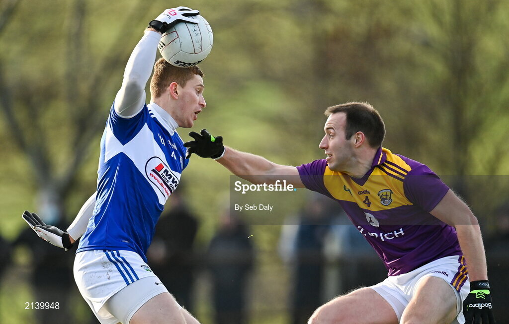 8 January 2022; Evan O’Carroll of Laois in action against Robbie Barron of Wexford during the O'Byrne Cup group B match between Wexford and Laois at Hollymount in Galbally, Wexford. Photo by Seb Daly/Sportsfile