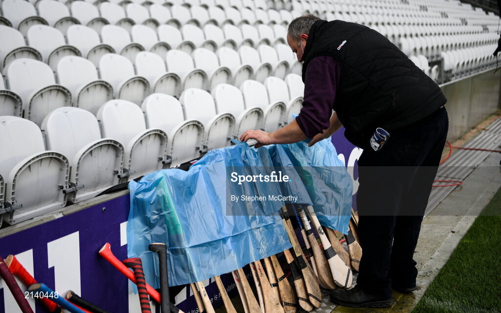9 January 2022; Ballygunner's Muiris Phelan shelters the hurls before the AIB Munster Hurling Senior Club Championship Final match between Ballygunner and Kilmallock at Páirc Uí Chaoimh in Cork. Photo by Stephen McCarthy/Sportsfile
