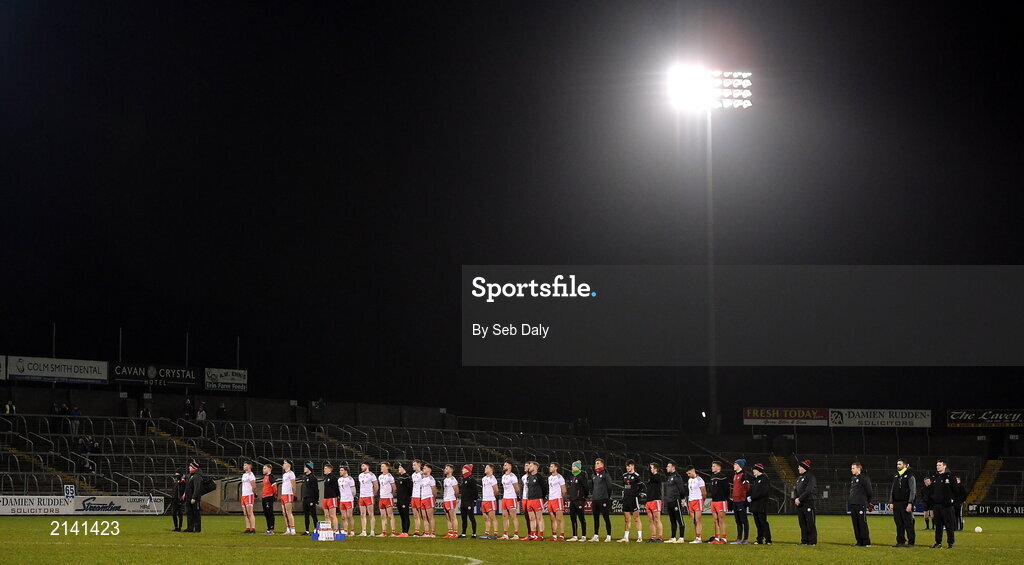 11 January 2022; Tyrone players during Amhrán na bhFiann before the Dr McKenna Cup round 2 match between Cavan and Tyrone at Kingspan Breffni in Cavan. Photo by Seb Daly/Sportsfile
