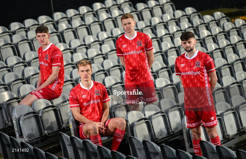 14 January 2022; Dundalk players, from left, John Martin, Greg Sloggett, Paul Doyle and Joe Adams at the launch of the club's new third choice strip at Oriel Park in Dundalk, Louth. Photo by Stephen McCarthy/Sportsfile