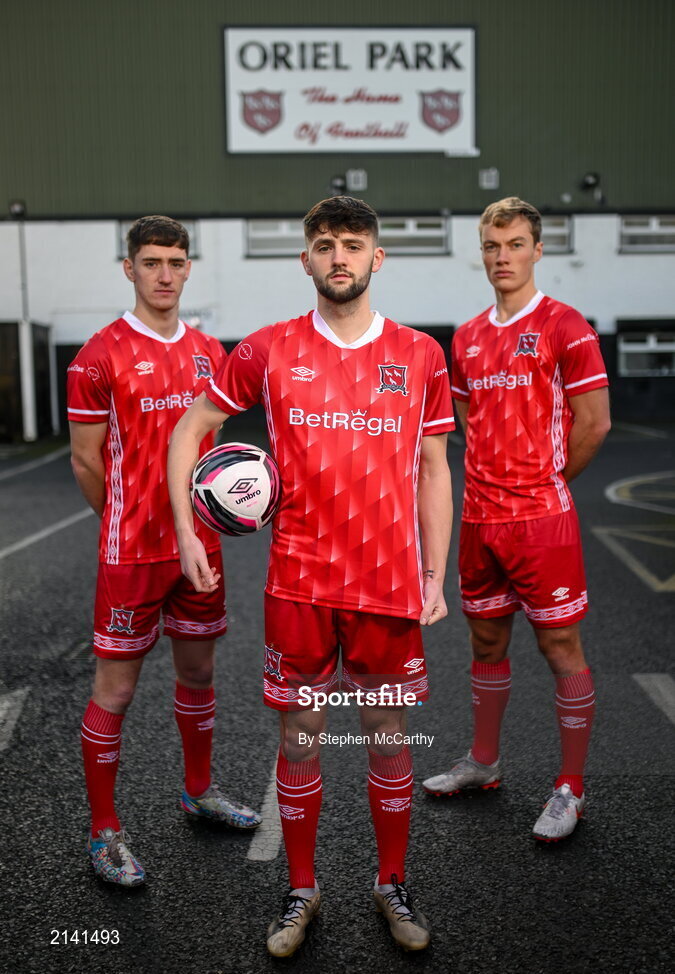 14 January 2022; Dundalk players, from left, John Martin, Joe Adams and Greg Sloggett at the launch of the club's new third choice strip at Oriel Park in Dundalk, Louth. Photo by Stephen McCarthy/Sportsfile