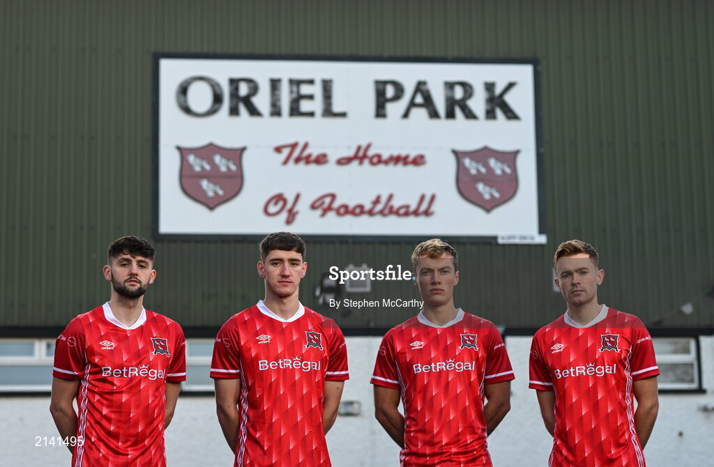 14 January 2022; Dundalk players, from left, Joe Adams, John Martin, Greg Sloggett and Paul Doyle at the launch of the club's new third choice strip at Oriel Park in Dundalk, Louth. Photo by Stephen McCarthy/Sportsfile