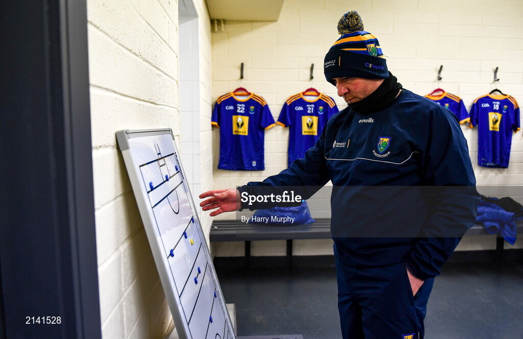 12 January 2022; New Wicklow manager Colin Kelly adjusts the tactics board before the O'Byrne Cup Group B match between Wicklow and Wexford at Bray Emmets GAA Club in Bray, Wicklow. Photo by Harry Murphy/Sportsfile