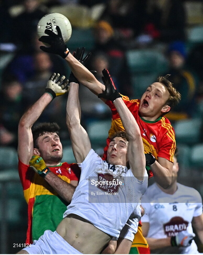 13 January 2022; Daniel Flynn of Kildare contests a high ball against Keegan Bradley, right, and Liam Brennan of Carlow during the O'Byrne Cup Group C match between Carlow and Kildare at Netwatch Cullen Park in Carlow. Photo by Eóin Noonan/Sportsfile